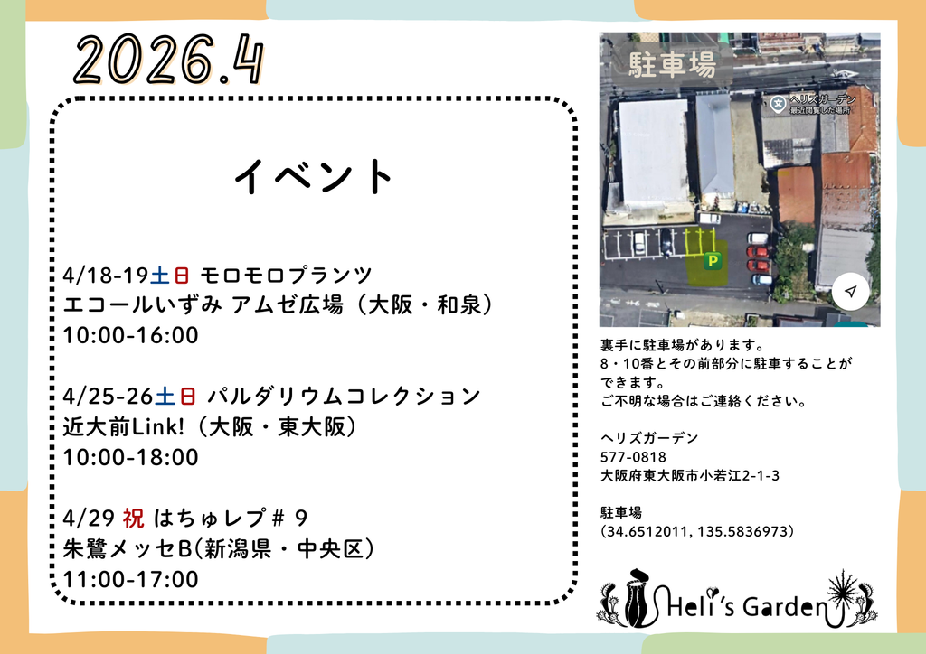 ご案内・店舗情報2024/7/2 19:002025/12/3 17:53バックヤード2024/7/2 19:002025/6/4 12:07食虫植物2024/12/6 12:592025/5/0 12:16ヘリズの輸入代行2025/8/0 17:182025/10/0 14:06 食虫植物友の会2025/9/1 6:122026/2/0 23:29